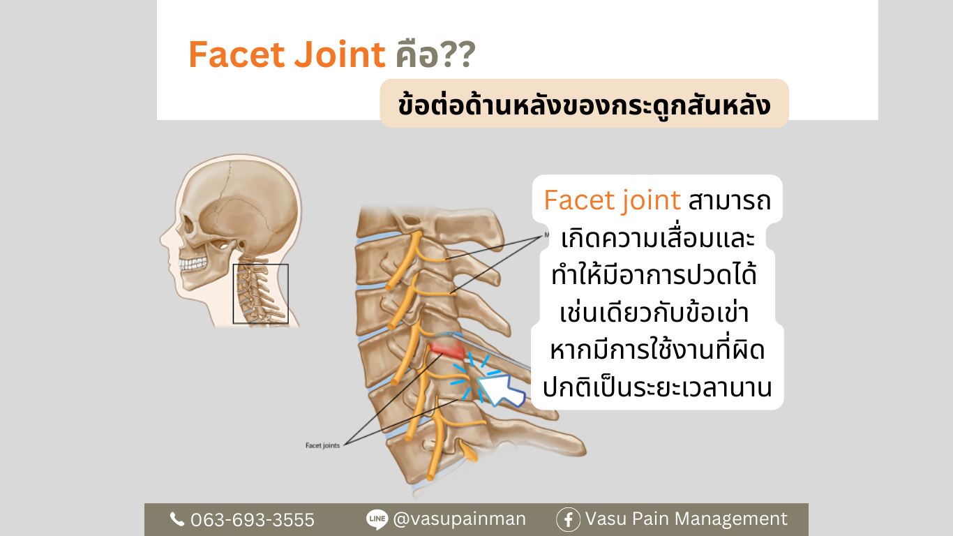 Facet Joint คือ ข้อต่อด้านหลังของกระดูกสันหลัง ซึ่งหากเกิดความเสื่อม จะทำให้มีอาการปวดคอบ่าได้ ซึ่งความเสื่อมนั้น เกิดจากการใช้งานที่ผิดปกติเป็นเวลานาน
