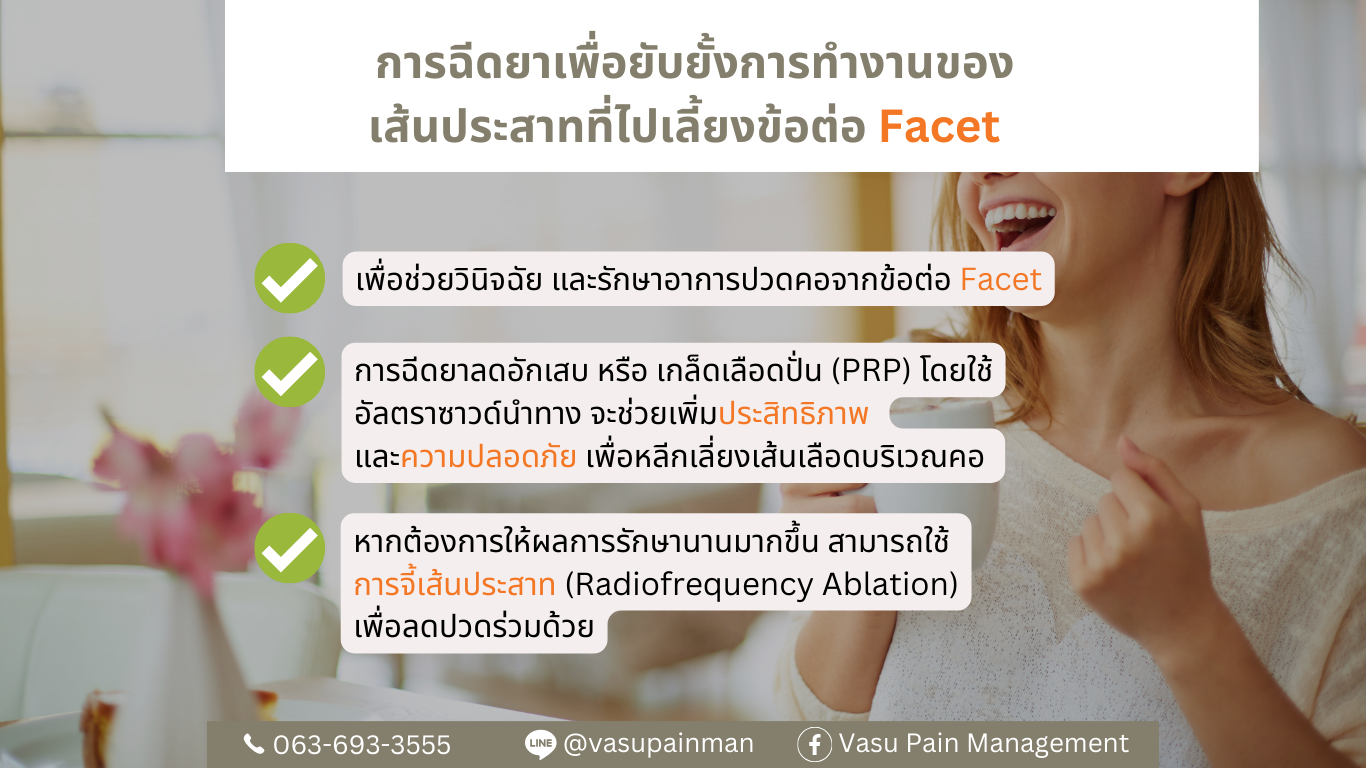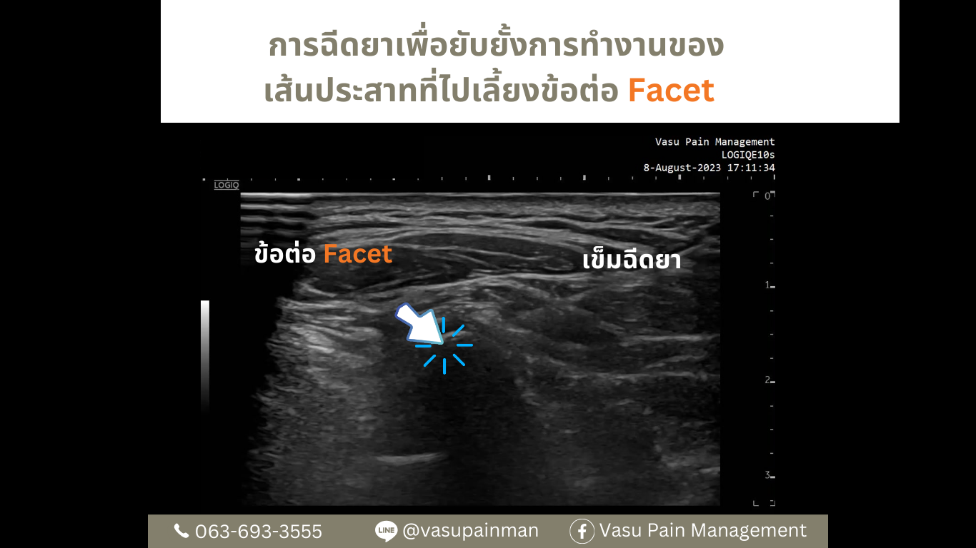 ที่ Vasu Pain Management เราจะแก้อาการปวดที่เกิดจากข้อต่อ Facet ด้วยการฉีดยาเพื่อยับยั้งการทำงานของเส้นประสาทที่ไปเลี้ยงข้อต่อ Facet โดยการใช้ Ultrasound ในการนำทาง