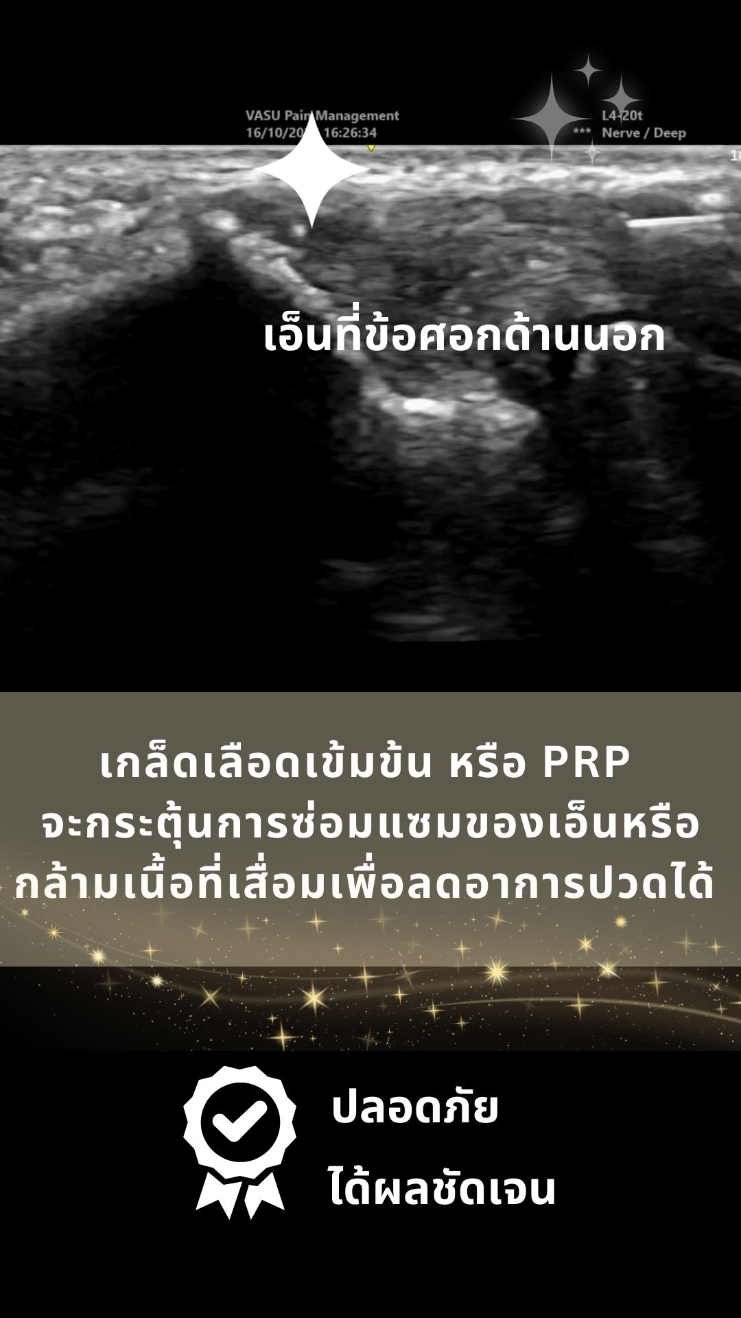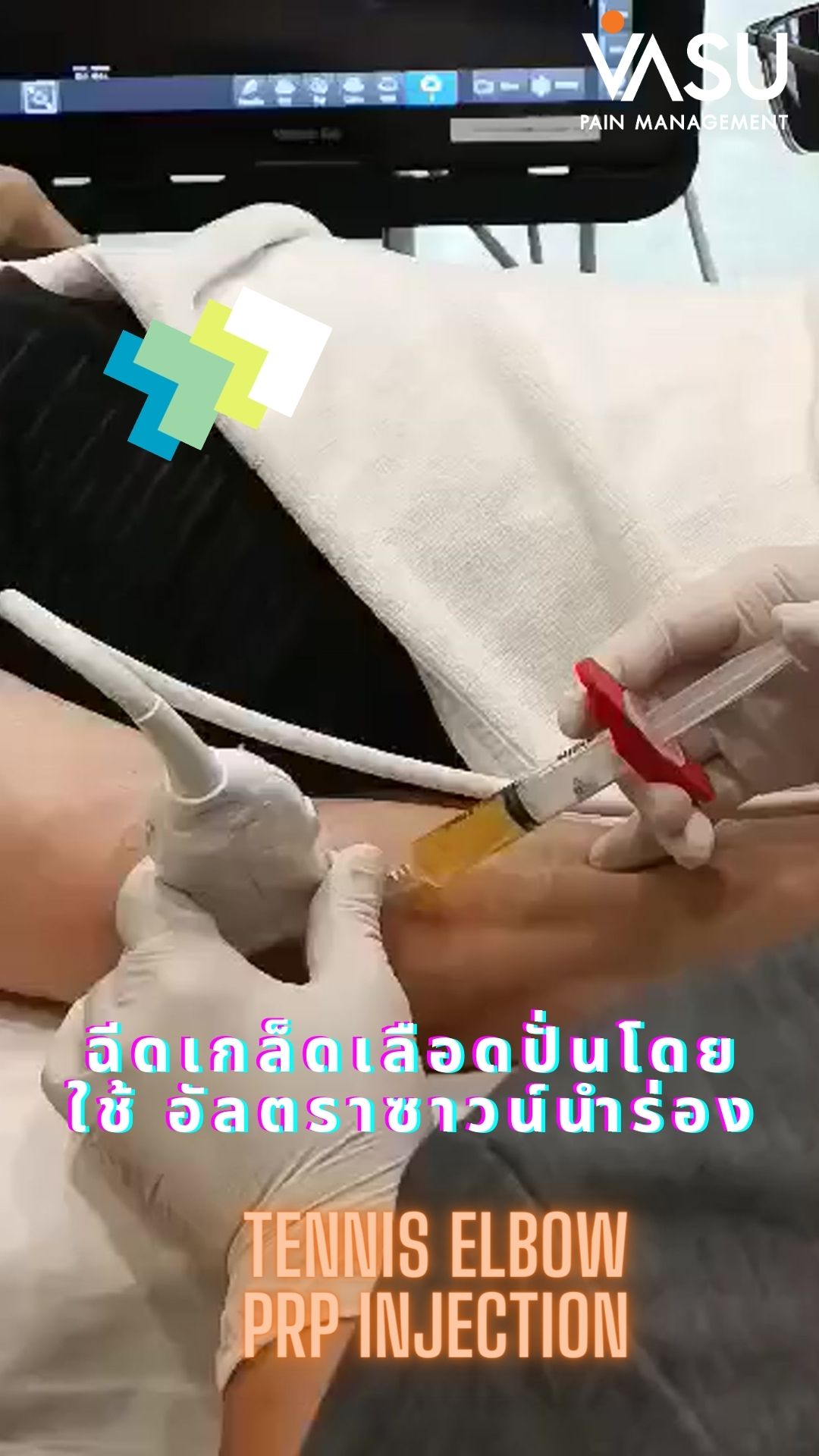 โดยที่ Vasu Pain Management เราจะใช้เกล็ดเลือดเข้มข้น (PRP) ฉีดบริเวณเส้นเอ็นที่มีปัญหาเสื่อม โดยเกล็ดเลือดเข้มข้น จะกระตุ้นการซ่อมแซมของเอ็นหรือกล้ามเนื้อที่เสื่อม ทำให้ลดอาการปวดลงได้