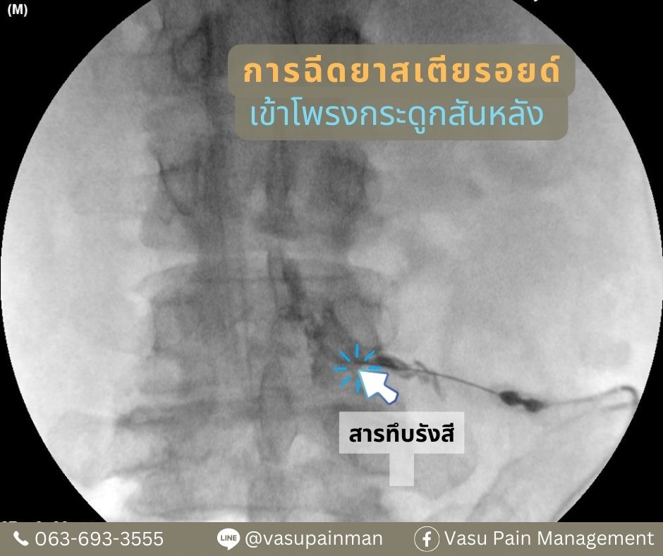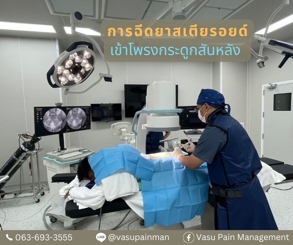 ที่่ Vasu Pain Management มีการฉีดยาสเตียรอยด์เข้าโพรงกระดูกสันหลัง โดยจะทำในห้องผ่าตัดที่ได้มาตรฐาน มีการใช้เครื่องเอกซเรย์ฟลูโอโรสโคปี (Fluoroscope guidance) ในการระบุตำแหน่ง ทำให้การฉีดยาตรงจุด โดยการฉีดยาจะใช้เวลาประมาณ 30-40 นาที โดยฉีดยาชาก่อน ทำให้อาการปวดขณะทำน้อย และหลังทำสามารถกลับบ้านได้เลย
